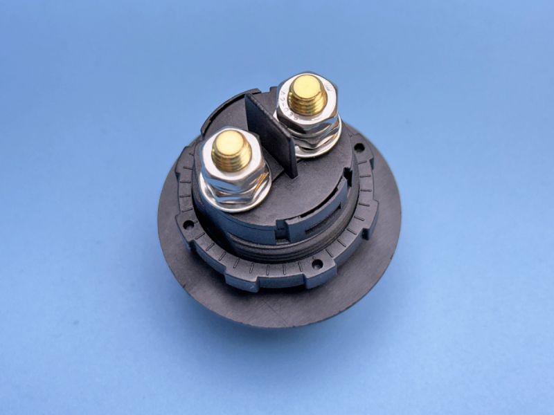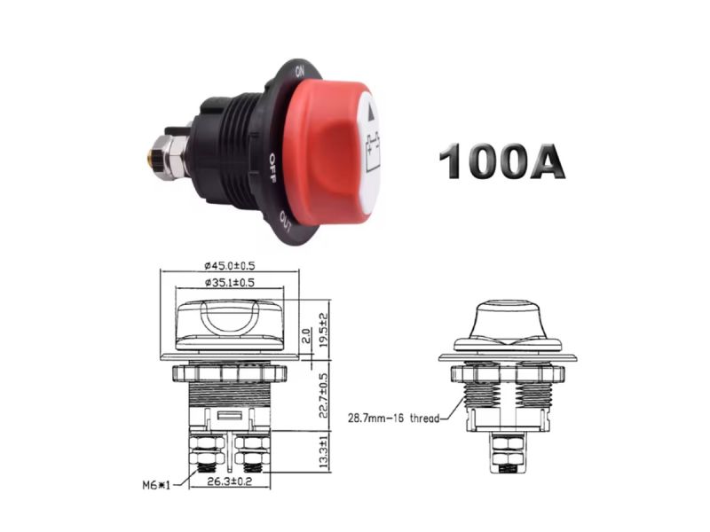 Выключатель аккумулятора автомобиля на 100А непрерывного тока, водонепроницаемый, на 2 положения ON-OFF (SPST), напряжение 12-48В. Монтаж: клеммы с винтовыми креплениями. Материал: пластик ABS и средний внутренний сердечник, ручка удерживается.