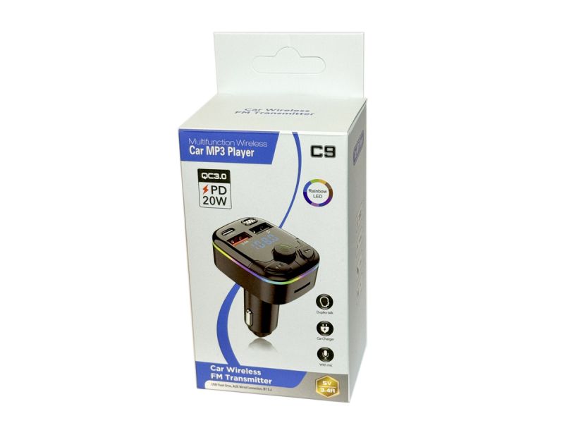 Автомобильный FM-трансмиттер C9 (Bluetooth 5.4, QC3.0, PD 20W, LED-подсветка) Технические характеристики: Bluetooth: версия 5.4 + EDR Частота Bluetooth: 2.402–2.480 ГГц 87.5–108.0 МГц Поддерживаемые форматы: FL 3 метров Материал корпуса: крепкий пластик Интерфейсы: Type-C PD-20W, USB 3.4А, слот для TF-карты LED подсветка, микрофон
