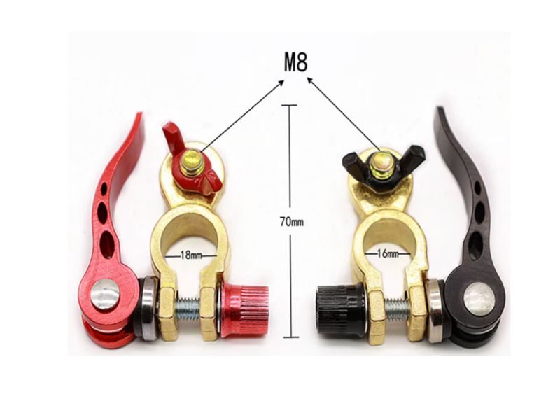 Автоэлектрика Комплект клемм аккумуляторных легкосъемных с эксцентрик зажимом. Диаметр плюсовой клеммы 19мм, диаметр минусовой клеммы 17.5 мм. Цинковый сплав с латунным покрытием. Вес 183г/пара. Многофункциональный зажим проводов.