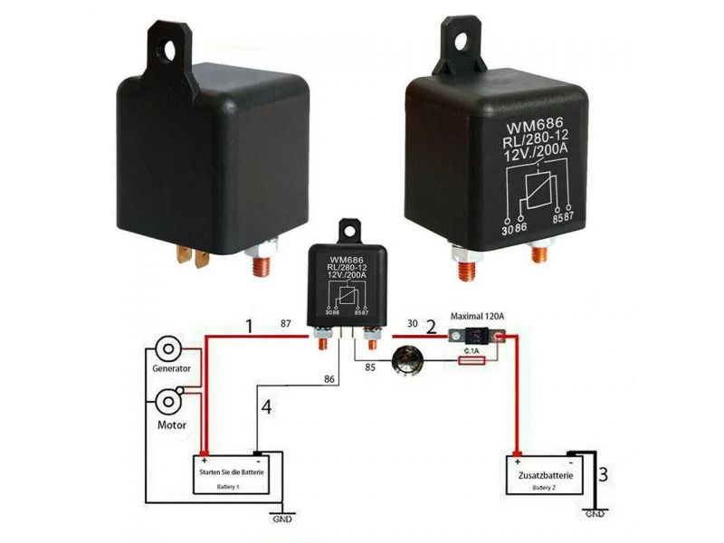 Электромагнитное реле силовое 12V 200А 4-контактное (SPST-NO). Медная обмотка, 2 медных контакта, термостойкий корпус. Предназначений для коммутации мощных электрических цепей в 12-вольтовых системах – стартеров, лебедок, компрессоров, дополнительного освещения, подогревателей и других энергопотребителей с высоким пусковым током.
